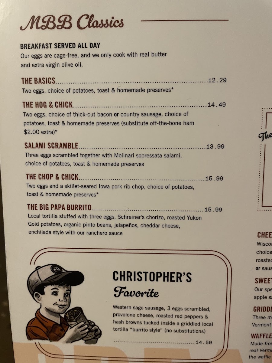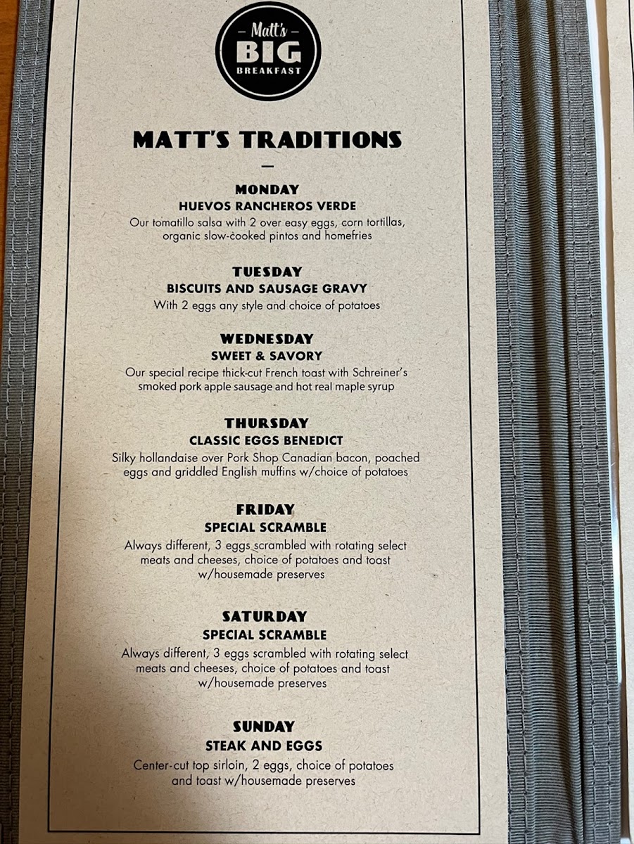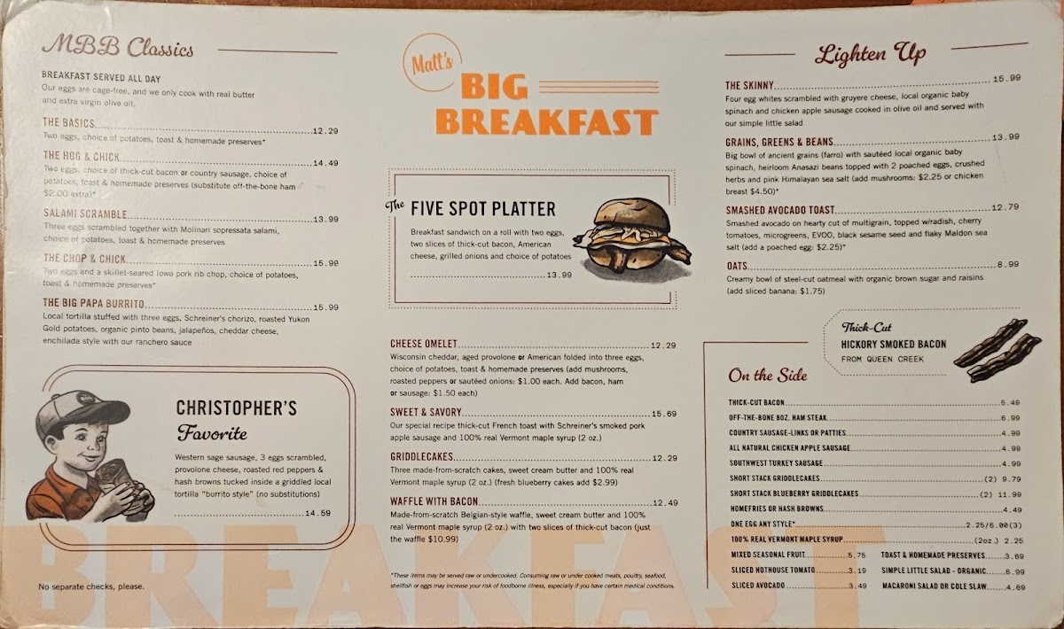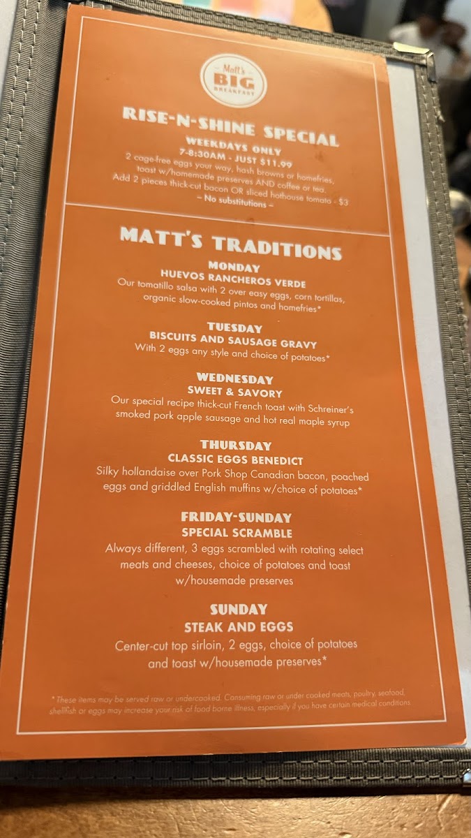 Big Matt knows what’s up! My family was impressed with the food and staff. I haven’t witnessed a staff that works together as well as Big Matt’s. Everyone was friendly, helpful, and quick. The food was delicious. This was our first visit and we went with the breakfast burrito, the 5 spot platter, and short stack of blueberry pancakes (a local favorite). I tried the Skinny which was light and healthy, I felt it was missing carbs (purposely) but you can add home fries. The only other thing missing was a gourmet coffee menu, but there’s plenty of shops around town. Big Mikes prides themselves on fresh, local ingredients. Try the orange juice, voted best we’ve ever had! I give five stars for the staff and flavor, but I would give 3 stars for the voice level. If you or a member of your party have sensory issues, this might not be your place. The metal chairs are a constant noise against the concrete floors. Keep that in mind for sensory sensitive guests. It was a bit of an over stimulation for me.