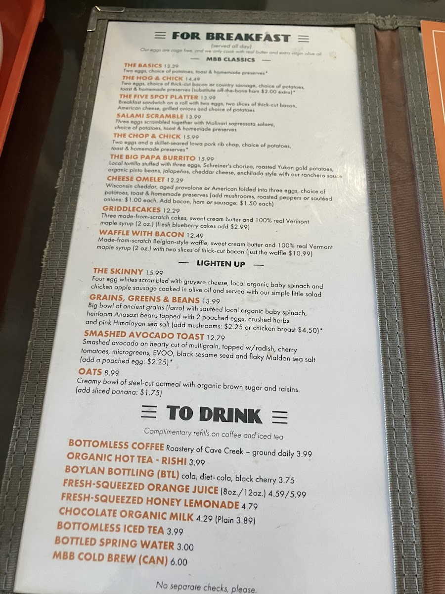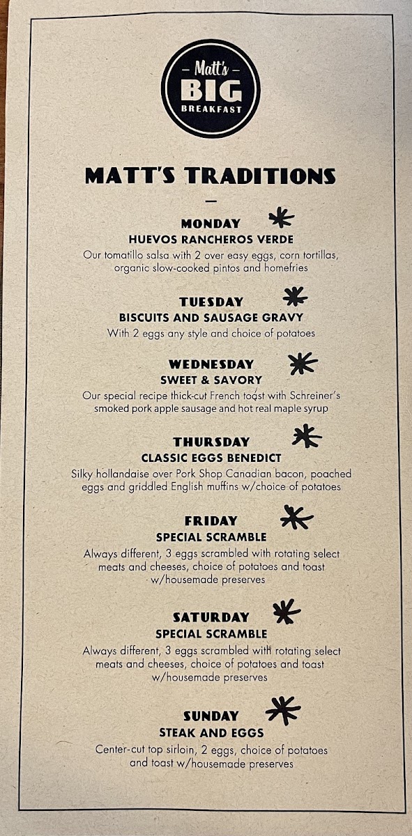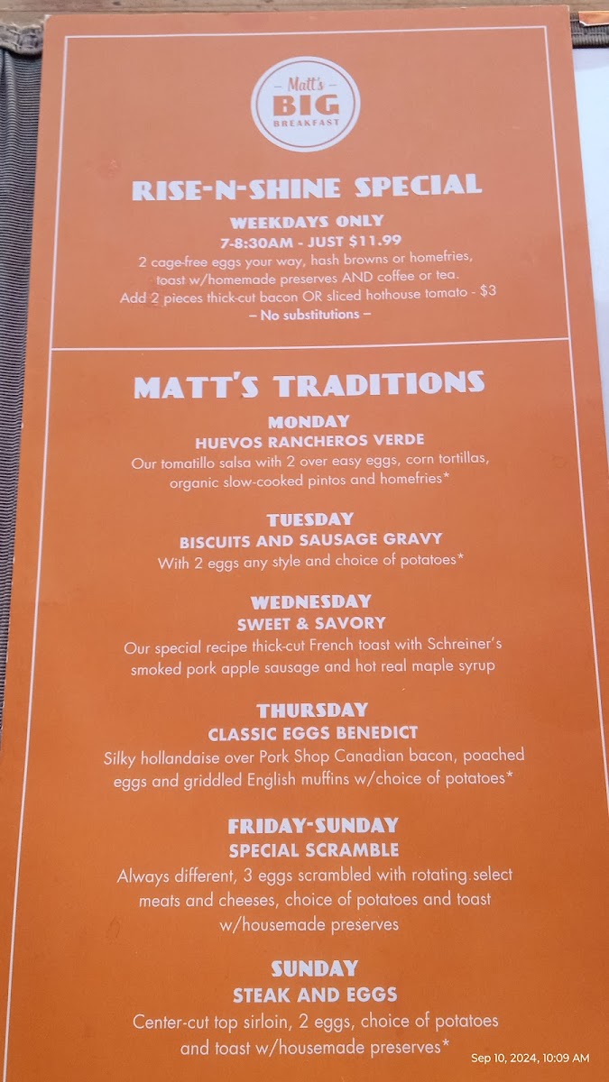 Our first time visiting Matt’s Big Breakfast from Miami and we were blown away! The service was incredibly fast and friendly—everyone was super attentive, always checking in to make sure we were okay. The food was absolutely amazing, and the prices were very reasonable. Everything we tried was delicious. I got the avocado toast & my husband got the special for the day. We would definitely come back here again!